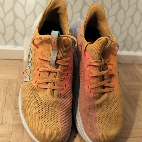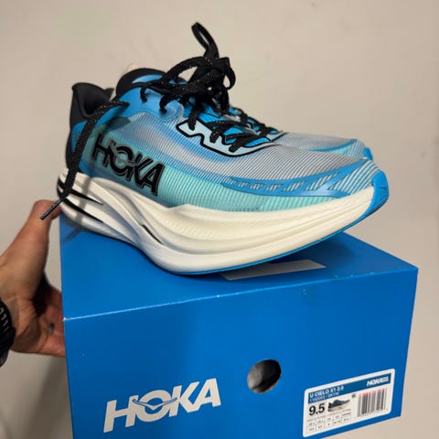 Hoka One One U Cielo X1 2.0 juoksukengät koko 43. Väri vaaleansininen, suunniteltu juoksuun. Kengät on valmistettu kevyestä materiaalista, joka tukee juoksuaskeleita.