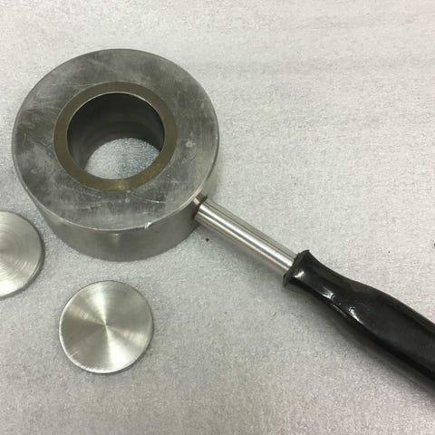 Kuminpaistomuotti korun valmistukseen kultasepille ym. Koko pituus 23cm, kiekot 56mm/7 mm paksut, pesä 10cm ja paksuus 5cm, teräsvaippa/alumiinipronssia. Nouto tai Huutopakettina 8e.