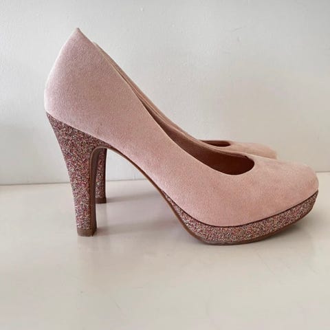 Ihanat sariinipintaiset, korallinväriset korkokengät, koko 37. Hintaan kuuluu myös samaan sävyinen juhlalaukku. Kunto hyvä. Yht 5€.