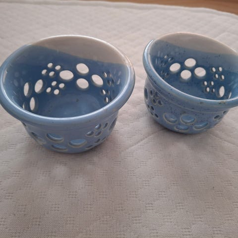 Vitriinissä säilytetty, käyttämättömät. Kakkoslaatua. Pieniä kauneusvirheitä joista kuvia. Korkeudet 11.5 cm ja 6.5 cm. Halkaisijat 11 cm ja 10 cm.