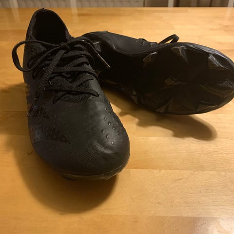Adidas Predator jalkapallokengät mustalla värillä. Kengät on suunniteltu tarjoamaan tukea ja pitoa nurmikentällä pelaamiseen. Kengissä on kiinteät nastat, jotka soveltuvat pehmeälle ja märälle nurmikentälle. Materiaali on joustavaa ja mukautuvaa, ja kengät on muotoiltu nilkkatukea varten. Väri musta valkoisilla yksityiskohdilla.