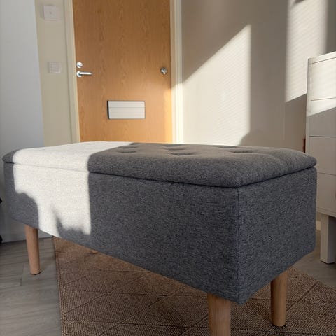 Hiekanvärinen kangas, vaaleat puujalat. Sopii olohuoneeseen, eteiseen tai makuuhuoneeseen.