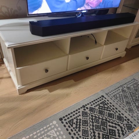 Tästä virheetön ja tyylikäs valmiiksi kasattu tv-taso hyvällä säilytystilalla.
