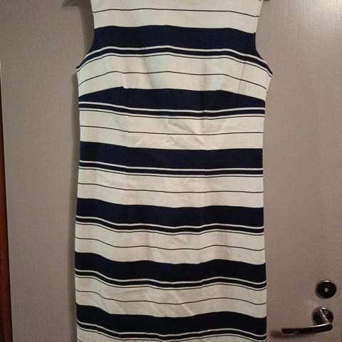 Kuvat 3-4: Seppälän mekko 40 kokoinen on ollut yhdellä tytöllä päällä muutamia kertoja. Mekko on siistissä kunnossa. Takana on vetoketju. Edessä olevan trikoomaisen kankaan johdosta leveys joustaa. Puuvillan seassa on elastaania. MITAT: Kainalomitta 37 cm x 2, sivupituus 68 cm. Katsothan mitat, mielestäni mekko on naftia kokoa.