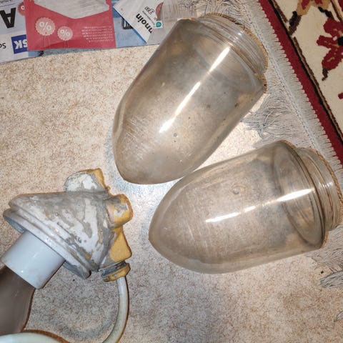 Hyväkuntoiset kattovalaisimen kuvut 1950-luvulta.Suunnittelija Lisa Johansson Pape.Kaksi kappaletta.Korkeus 120 mm, leveys noin 145 mm.Hinta yhteensä 40 €.