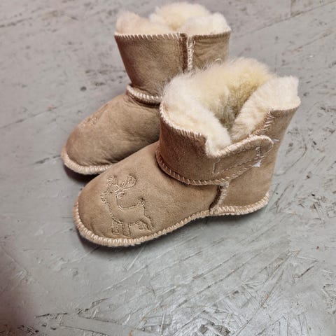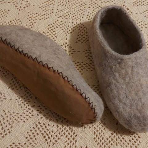 Mittatilaustyönä teetetyt poronnahkaiset tossut. Ollut talvella ulkokäytössä kuivilla pakkaskeleillä ja todettu lämpimiksi talvikenkien/paljasjalkakenkien korvikkeeksi. Sisus merinovillaa. Kuvissa ulkomitta. Tilattu n. 15 cm sisämitalla.
