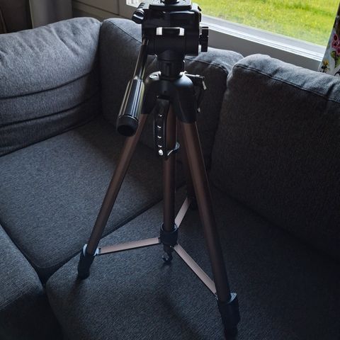 Kolmijalka kameralle. Itse käytin canonissa mutta sopii varmaan kaikkiin järjestelmäkameroihin. Jäänyt vähäiseen käyttöön eli nikamat edelleen jäykät ja tukevat.