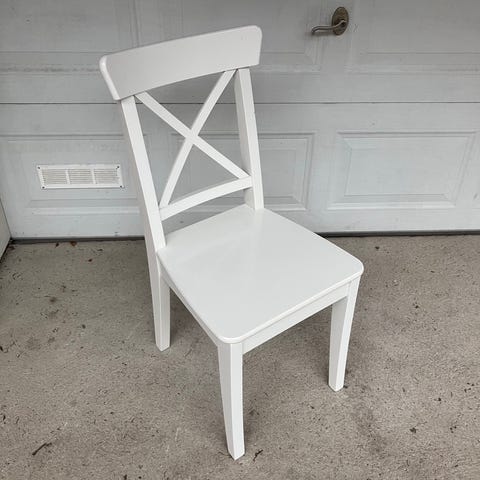 Ikean ruokapöydän tuolit. Maalattu ammattilaisen toimesta valkoiseksi. Jalat metallia. Toisesta tuolista maali hieman lohkeillut (näkyy toisessa kuvassa). Muuten pientä käytön jälkeä löytyy.
