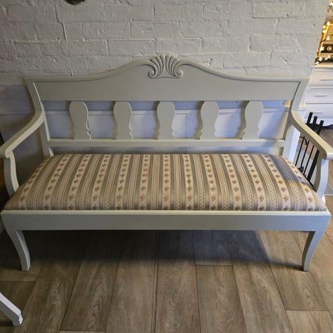 -60 luvun nätti ilmava ja kevyt pieni penkki. 122 cm leveä. Normaalit lievät elämänjäljet pinnoissa. Yleiskunto oikein siisti. Penkki Kokkolassa 240,-