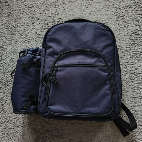 Täysinvarusteltu picnic-reppu, jossa astiat neljälle hengelle, leikkuualusta, leipäveitsi, kylmäosio ruuille ja picnic-viltti. Vain nouto. Käteinen tai mobilepay.