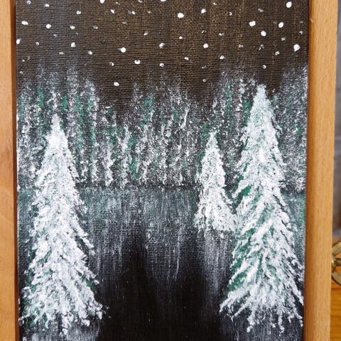 Myydään akryylimaalaus, Talvinen yö. Taiteilija on R. Latvasto. Akryylimaalaus on maalattu maalauspohjalle, jossa kangas on pinnoitettu kovan pohjan päälle. Koko on 15 x 21 cm.