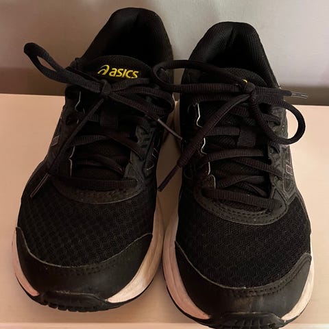 Asics juoksukengät, koko 38, musta väri. Kengät on suunniteltu juoksuun, ja niissä on kumipohja, joka tarjoaa pitoa erilaisilla alustoilla. Materiaali on hengittävä ja mukava jalassa. Sopii juoksuharrastajille ja urheilukäyttöön. Suosittelen kenkiä 37/38 koolle. Itsellä on 39 ja kengät ovat liian pienet varsinkin juoksuun