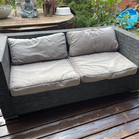 Valkoiseksi maalattuja eurolavoja terassisohvaksi
