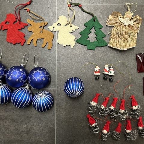 Erilaisia joulukuusenkoristeita, voi ostaa yhden tai useamman, hyväkuntoisia, koristeet tehty mm. huovasta, puusta ja langasta, joulusukan reunasta irronnut hieman koristenarua (kuvat 9 ja 10), pieni joulusukka 50 snt, lumiukko 1 €, joulukuusi 50 snt, puinen joulupukki 1 €, pieni tonttu 50 snt, enkeli 50 snt, koko paketti 4 €