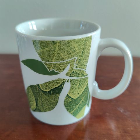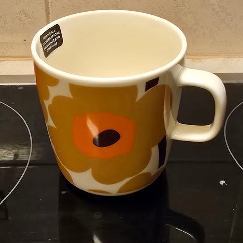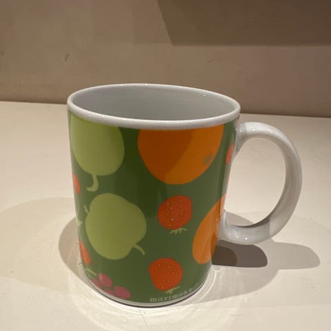 Myydään marimekon muki, jossa Teresa Moorhousen kuosi "onni" vuodelta 2006.