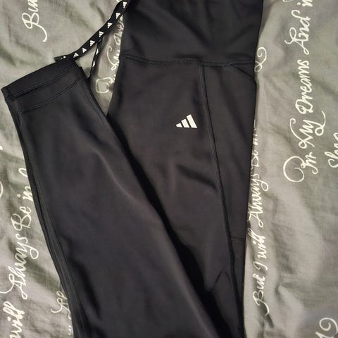 Adidas treenitrikoot, musta väri, koko M. Valmistettu joustavasta ja hengittävästä materiaalista, sopii salitreeniin. Vyötäröllä leveä kuminauha, jossa Adidas-logo. Trikoissa on valkoiset raidat sivuilla.