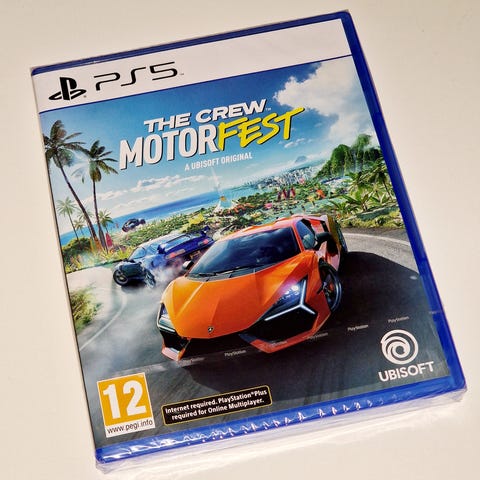 The Crew Motorfest -peli Playstation 5 -konsolille. Levy ja kotelo on lähes uudenveroisessa kunnossa, ja levy on naarmuton.