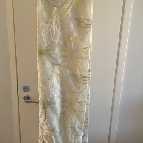 Vihreän sävyiset, hyväkuntoiset puuvillaiset verhot.