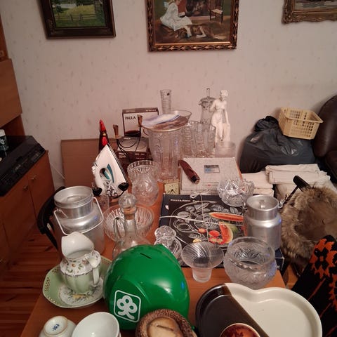 + - 100 vuotta vanhoja kippoja ja kuppeja. Kahvimyllykin löytyy ja mekanismi näyttäisi toimivan.