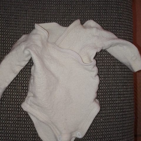 Vauvan yöpuku, jossa 85% merinovillaa ja 15 % silkkiä. Yöpuvussa on käännettävät lahkeensuut. Yöpuku on muuten hyvässä kunnossa, mutta kauluksessa ja takana on aavistus tummentumaa, edessä pieni reikä ja takana silmäpako. Pesty villapesuaineella. Lemmikitön ja savuton talous. Nouto tai toridiili.