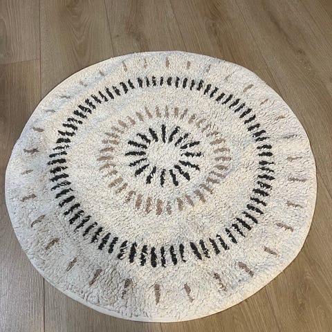 Siisti valkoharmaa kylpyhuoneen matto, halkaisija n. 65 cm.