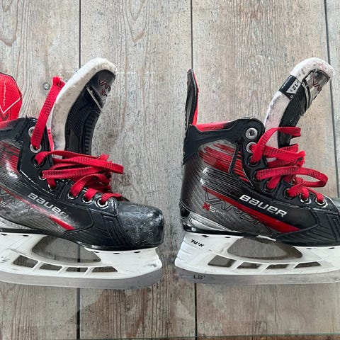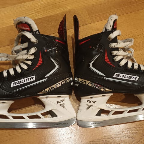 Bauer Vapor jääkiekko luistimet, lasten koko 30. Värit musta ja punainen. Käytetyt luistimet, joissa näkyy käytön jälkiä. Soveltuvat jääkiekon harrastamiseen.