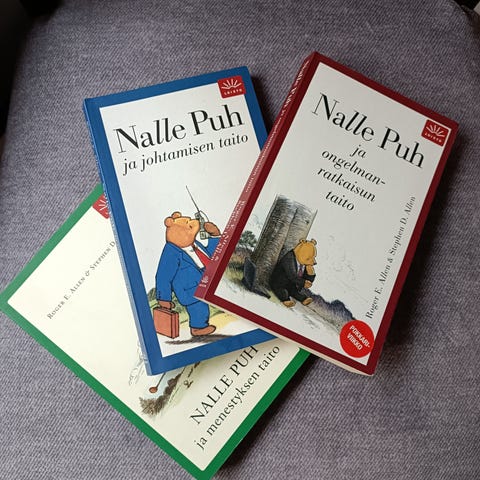 Kolme Nalle Puh -kirjaa. Nalle Puhin jumppakirja, Nalle puh ja tao /Nasu ja Te, Puhstradamuksen ennustukset. Kaikki kirjat siistejä, ei tahroja ei puuttuvia sivuja. Aika kellastanut sivuja.