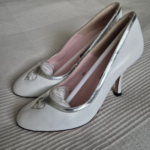 Punaiset mokkanahkaiset Minna Prikka avokkaat, joissa vaaleita yksityiskohtia. Yksityiskohdissa näkyy hyvin pieniä värjäymiä, kun todella läheltä katsoo ja kenkien sisäsyrjässä muutama hankaus jälki. Nämä saa varmaan putsattua, ainakin vaaleammiksi, jos ei kokonaan pois. Jäljet näkyvät kuvissa. Melko vähän käytetyt. Kengät tulevat alkuperäisessä laatikossa, jossa mukana hoito-ohjeet.