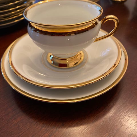 Ohutta posliinia, 8 hyväkuntoista settiä, lautasia isoja 11, pieniä 12, kuppeja 10, joista siis kahdessa kupissa pieni lohkeama reunassa.