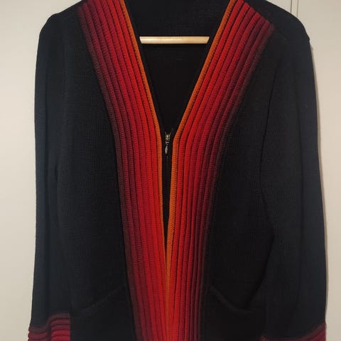 Tanskalaisen Studio merkin joustavaa jersey neulosta oleva takki tai neuletakki. Laatu nyppyyntymätöntä 63% puuvillaa ja 37% viskoosia. pituus 80cm, kai - kai mitta 67cm, vartalon ympärys 128cm, hihan pituus 60cm, väljä hiha. Värit musta, valkoinen. Kenno kuvio erikoisuutta etsivälle. Reilut taskut edessä, vuoriton.