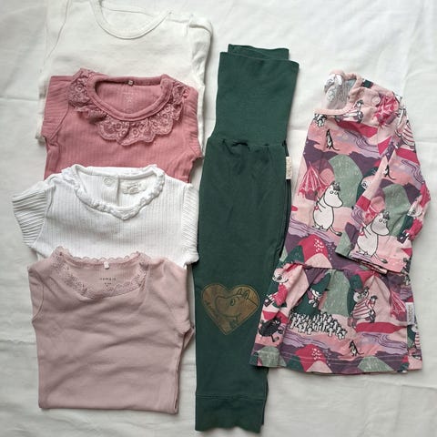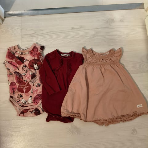 Setissä kaksi pitkähihaista mekkoa (Newbie koko 74 ja guppy koko 80), lyhythihainen mekko (name it koko 74) ja shortsihaalari (moomin koko 80). Name it -mekossa jotain pientä tahraa merkin kohdalla, tästä kuva. Moomin haalarissa myös pieni tahra kts kuva. Kaikki ovat useammalla lapsella käytössä olleita. Hajusteeton pesu, lemmikitön ja savuton koti. Nouto/toridiili.