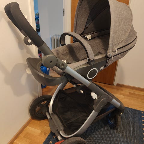 Harmaat Stokke Trailz vaunut. Olleet meillä käytössä 2 lapsella muiden vaunujen ohella.