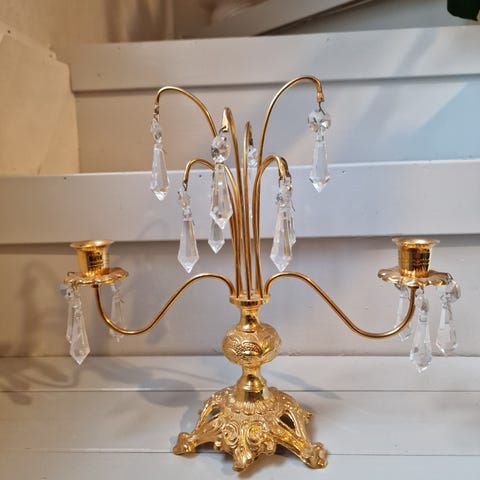 Koriste-valon 24 karaatin kultauksella oleva kynttiläjalka, jossa kristalli koristeet. Mitat kuvissa.