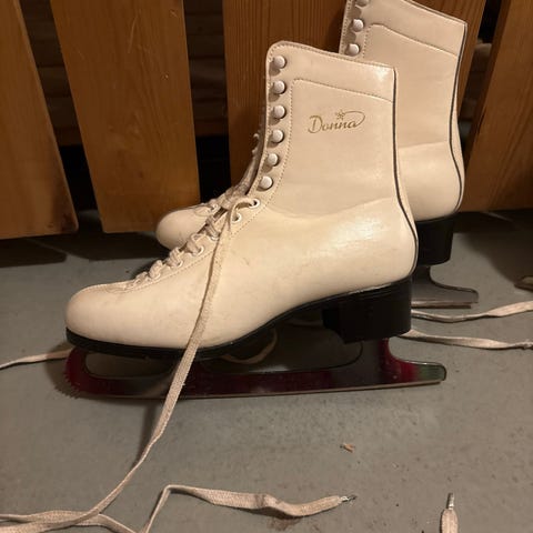 Donna luistimet koko 42, valkoinen väri. Luistimilla on luisteltu ehkä pari kertaa. Irrotettavat pohjalliset. Pohjallisen mitta 27cm.