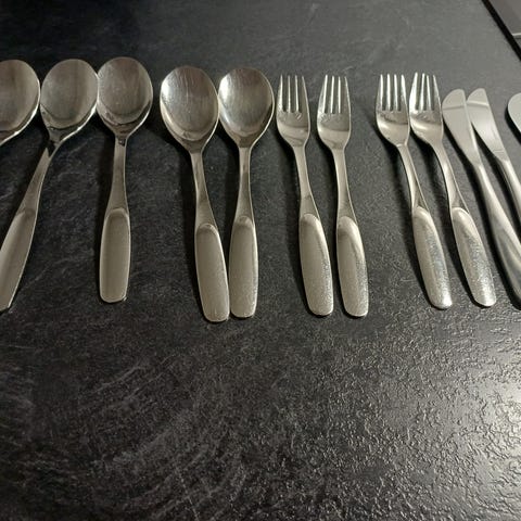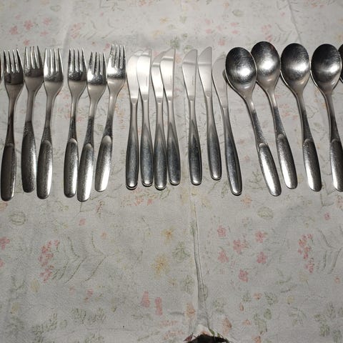 6 kpl veitsiä, 6 kpl haarukoita ja 6 kpl ruokalusikoita.