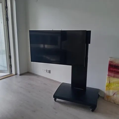 Musta TV-teline, jossa on lasinen alusta. Telineessä on säädettävät kiinnikkeet, jotka sopivat erilaisille televisiomalleille. Teline on valmistettu metallista ja lasista, ja se tarjoaa vakaan tuen televisiolle.