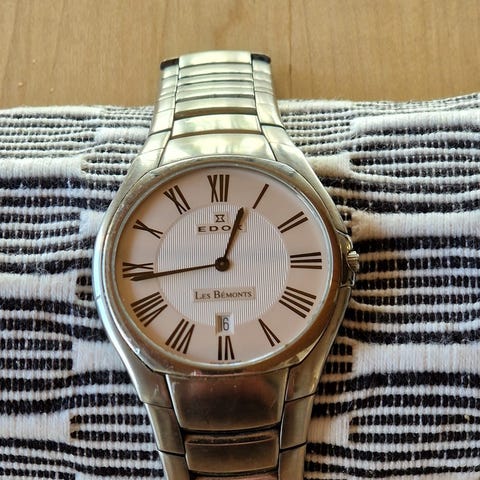 Vetokello. Koko 37x41mm. Kello muuten ikäisekseen siistissä kunnossa mutta taulun mustaa kaarta joku paikkaillut tussilla klo 2 ja 3 väliltä.