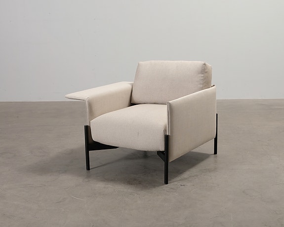 Verhoilussa haalistumaa ja tyynyjen untuvatäytteet ovat hieman purkautuneet. Toisessa istuintyynyissä tummentumaa. Jaloissa kevyttä kulumaa. Yleisvaikutelma hyvä.