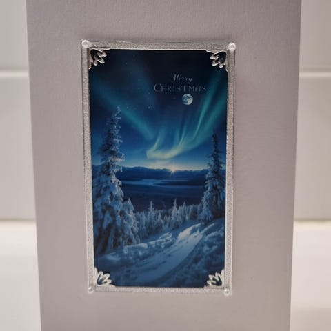 Joulukortti, jossa sininen talvimaisema ja koristeelliset hopeanväriset kulmat. Kortti on taitettava ja sisältää erilaisia talvisia ja jouluisia kuvia, kuten revontulia ja joulukuusia. Kortti sopii joulutervehdyksiin. (Itsetehtyjä ja kuva suunniteltu ja tulostettu). Postitus myö onnistuu jos on toivetta.
