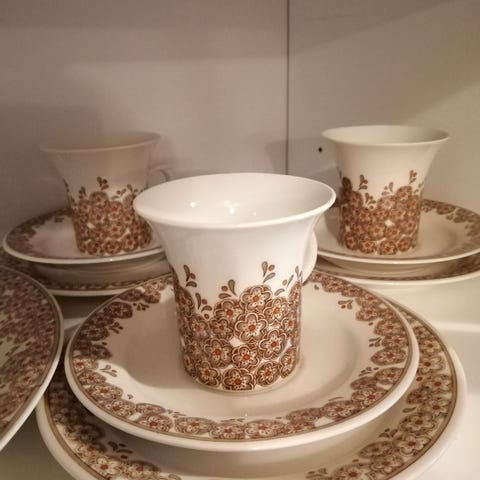 Myydään kaunis Arabia Veronica -astiasto, sisältää 9 kahvikuppia, 13 aluslautasta sekä yhden isomman lautasen.