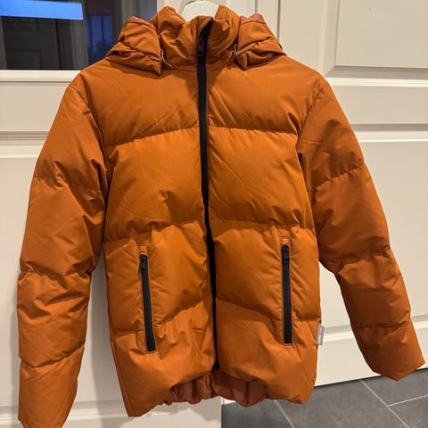 Aniliininpunainen tyttöjen toppatakki, joka on ollut vain yhden lapsen käytössä. Valkoisia ja punaisia palloja. 3/4 pituinen mitta ja vyötäröllä kiristettävä kuminauha.