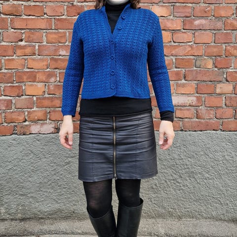 Istuu vyötäröltä ja sopii hyvin vielä L-kokoiselle. Hihat ovat puhvihihat. Kaunis!