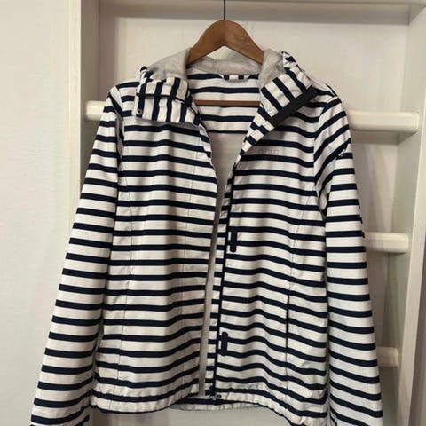 Helly Hansen takki mustassa värissä, naisten kokoon S/M. Takki on kaksipuoleinen, jossa toisella puolella näkyy Helly Hansen -logo rinnassa ja toisella puolella selässä. Materiaalitietoja ei ole annettu. Takissa on joitakin käytön jälkiä, kuten kuvan osoittamat tahrat. Lähtevät varmasti pois ei kokeiltu