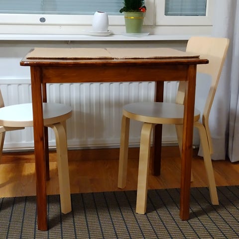 Pöytälevy on pohjamaalattu ja tasattu huonekalukitillä, ja pinta on maalattu Tikkurilan Helmi akrylaattimaalilla, joka on kerinnyt jo nuhraantua käytössä. Tahrat ovat luultavasti mustikkapilttiä.