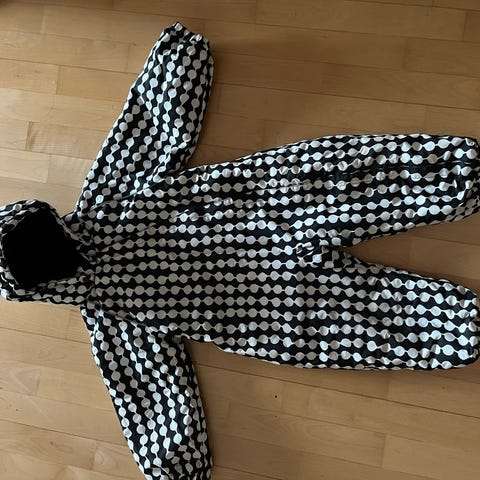 Lämmin haalari ,yhdellä tytöllä viimetalvi.ostettu uutena.Siisti ja ehjä paitsi reiden puoli lahkeessa pinta nirhaumaa vähäluminen talvi niin hiekka naarmuttanut .katso kuva 2. Kumilenksut ja hihan suut ehjät myös.