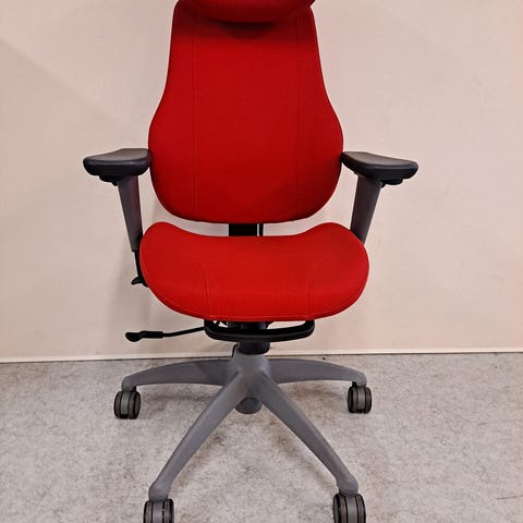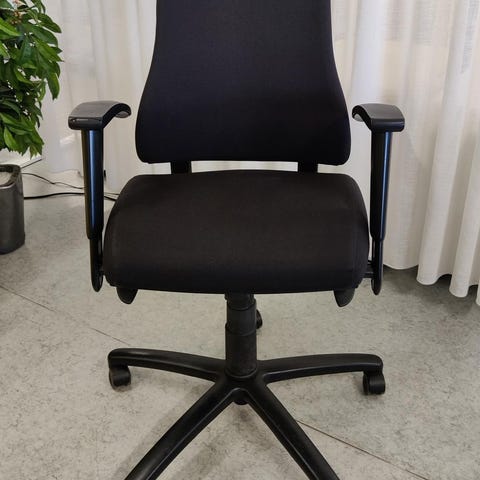 Käytetty, huoltotarkistettu Rabami niskatuellinen työtuoli. Tuolin yleiskunto on hyvä, ainoastaan kangasverhoilussa on vähän tummentumaa havaittavissa vielä pesunkin jälkeen.