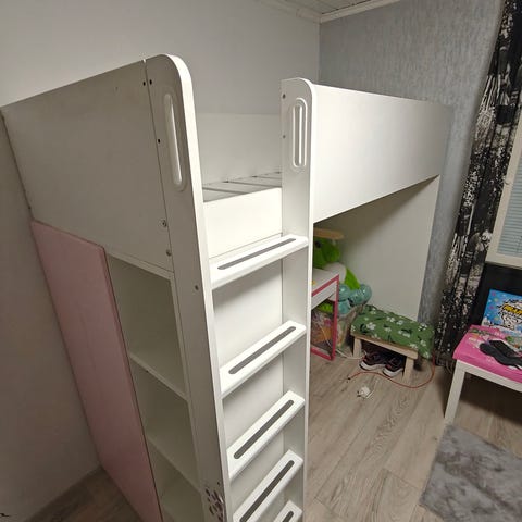 VARATTU: Parvisänkykokonaisuuteen kuuluu laatikollinen kirjoituspöytä, laatikollinen vaatekaappi sekä kirjahylly. Kokonaisuus sopii pieneenkin tilaan ja on muunneltavissa esim. kirjoituspöydän voi sijoittaa sängyn suuntaisesti tai poikittain. Vaatekaapin ovet on liitutaulumaalia. Kokonaisuus kuvan mukaisesti on syvyys 104cm, leveys 205cm ja korkeus 182cm. Patjan vastaavat 90cm, 200cm ja max 20cm. Työpöytä on 60cm syvä ja 148 leveä ja 73cm korkea. Patjan saa mukaan.