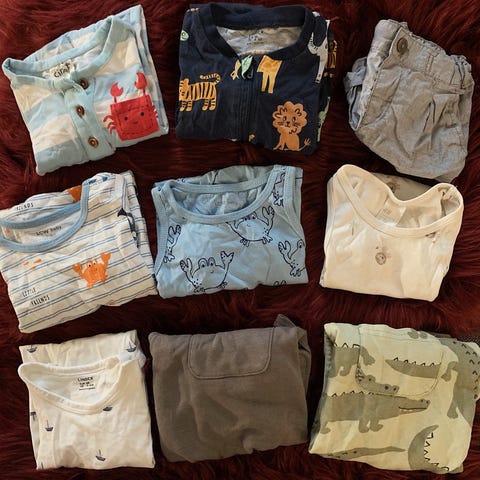Neljä bodya, yksi paita, yhdet farkut, kypärämyssy ja tumput. Useilta merkeiltä.