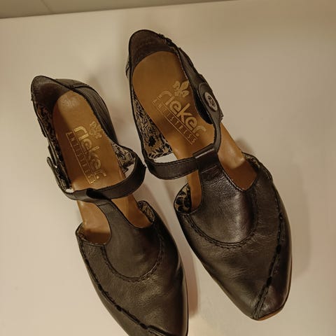 Hyväkuntoiset ja nätit Riekerin nahkanilkkurit. Mustat, koko 38 (sisämitta n 24,5-25 cm). Ohuet nauhat sekä sisäsyrjässä vetoketju. Sisäpuolella lämmin vuori, joka on kantapäiden kohdalta jonkin verran kulunut. Hp 18 euroa.