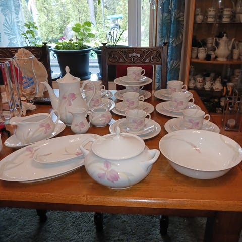 Astiasto jossa 3kpl tarjoilu astia, 1kpl kannu, 7kp pieni lautanen, 6kpl iso lautanen ja 6kpl syvä lautanen, astiat todella siistissä kunnossa. Harmaita kukkia ja kulta reunukset kaikissa.